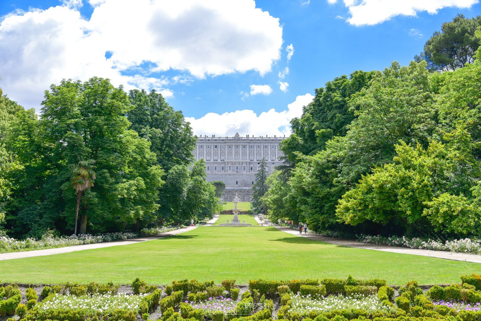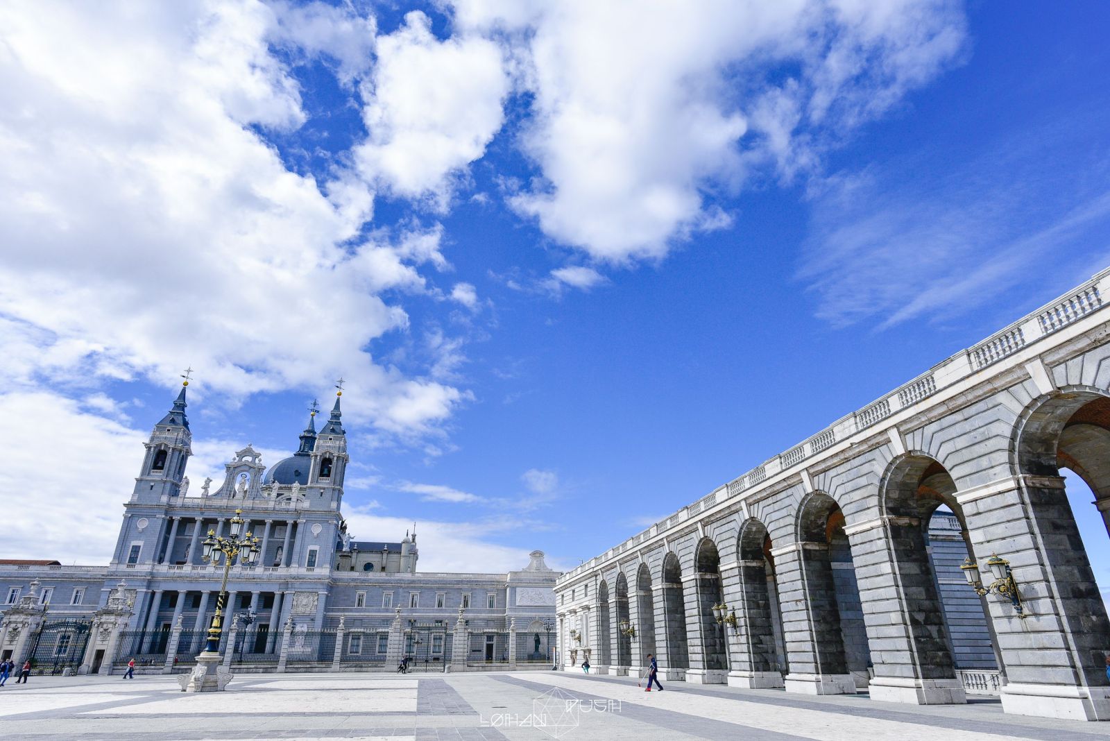 從廣場往後看是阿穆德納聖母主教座堂,而廣場的側邊,則是許多拱門連接而成的走廊,從走廊可以俯瞰佔地廣大的摩爾人花園。皇宮不愧是皇宮,連路燈都設計的如此精緻,與灰白主建築物相比下,更顯華麗。