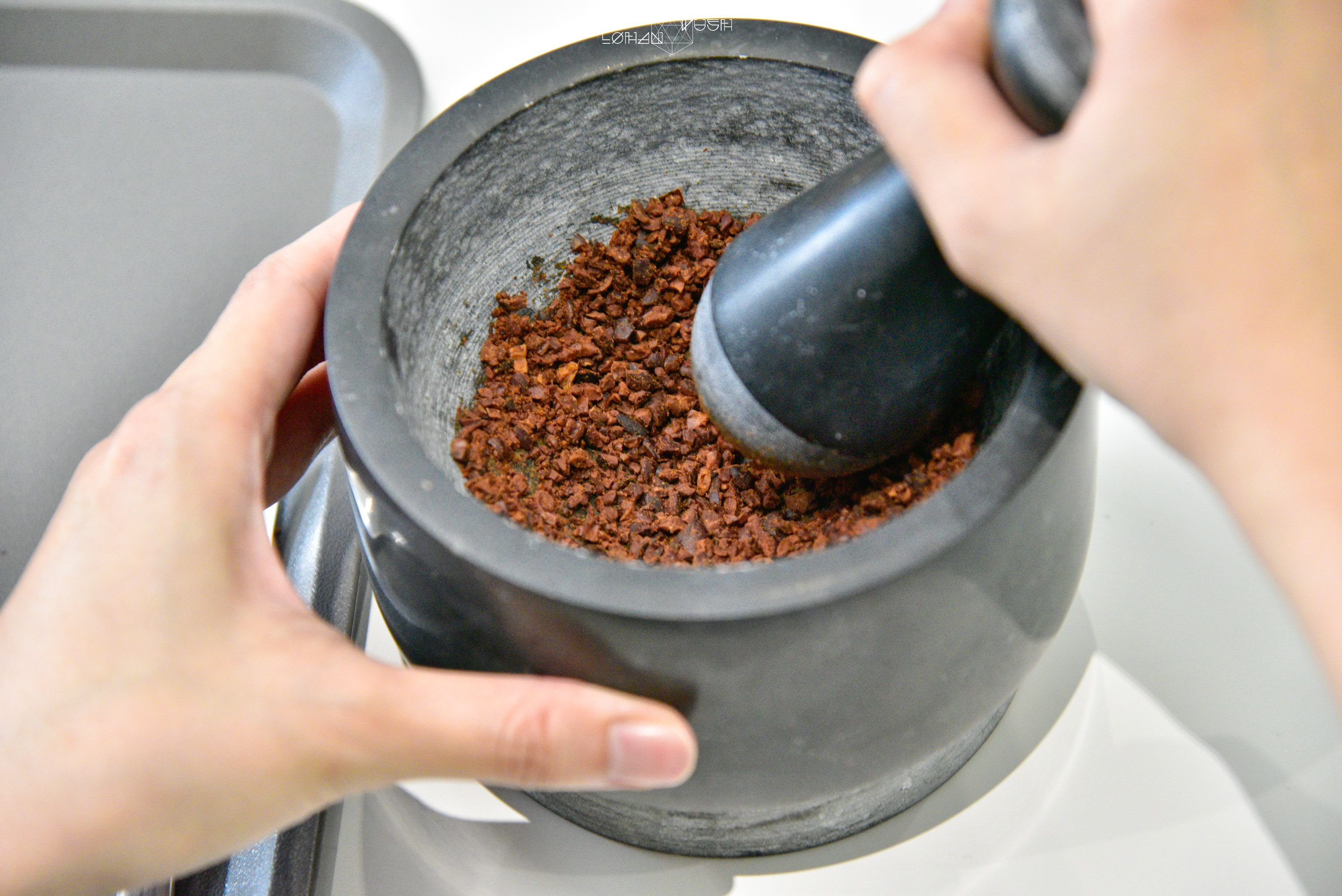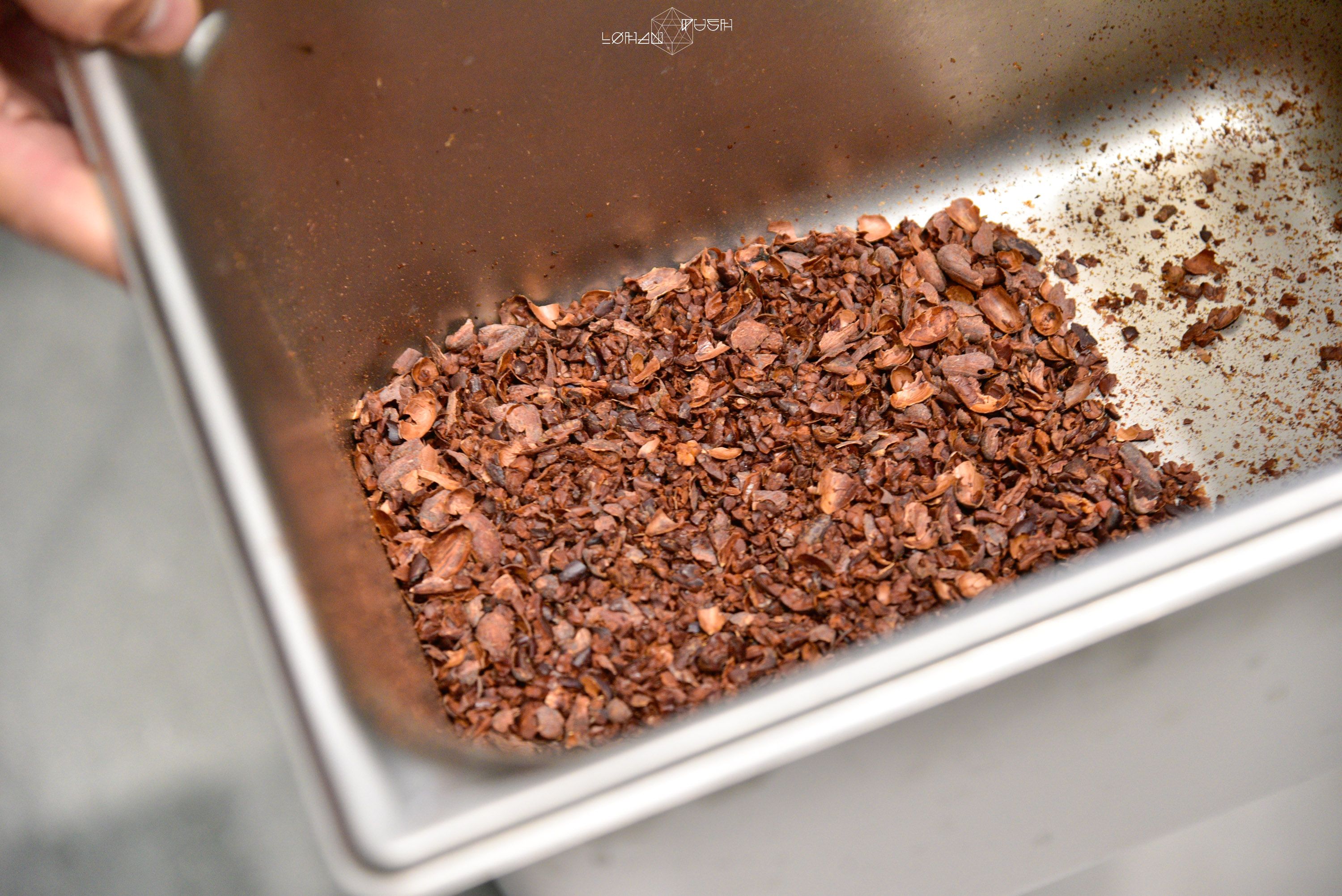 接著讓大家親手撥開烘烤過後的可可豆,探索裡面的可可。手撥可可豆不是很輕鬆的一件事情耶,要完好的把可可撥出也有點難度。不過幸好現代科技的進步,有機器可以取代手撥,解說員使用機器快速的破碎可可豆,並將外殼與果實分開,接著就可以讓我們自己動手做巧克力啦。