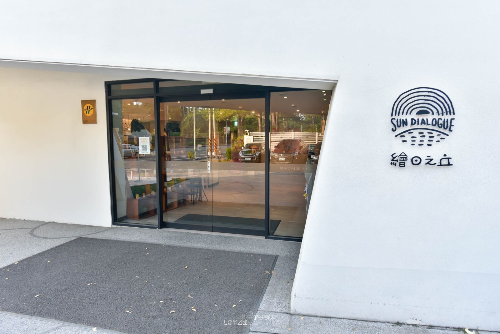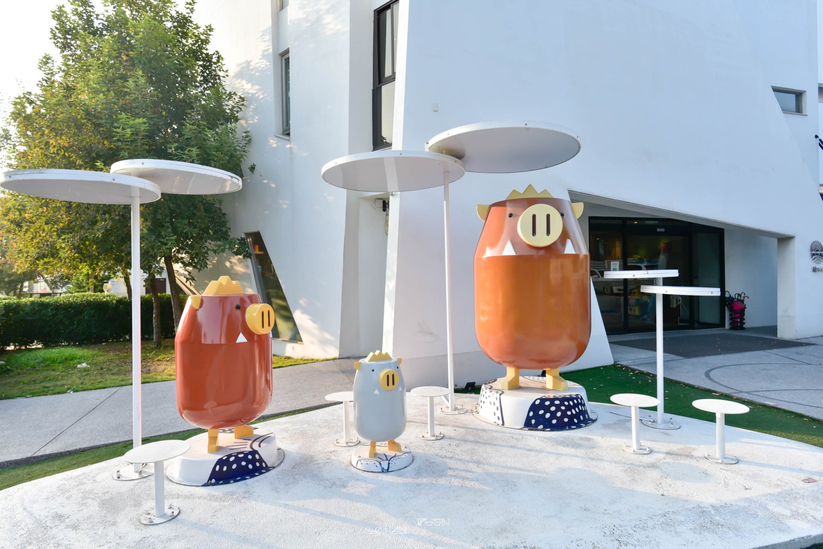 老漢這次預定的輕逸三人房是類似汽車旅館的型態,有自己獨立車庫的房型,但同樣需先check in得到房卡後才能從另一邊的車道入口進入。所以到達時一樣要先把車暫停在天成文旅大門口後進入辦理入住手續。飯店門口,有著繪日之丘吉祥物嘟比,圓滾滾的身軀及大大的豬鼻很可愛,也是大家會來拍照打卡的景點。