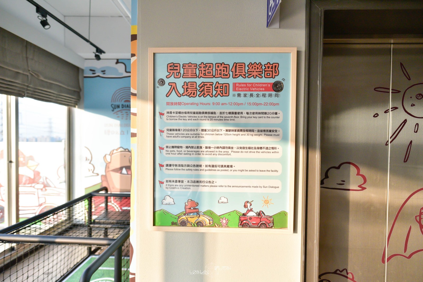 7樓除了室內遊戲空間外,外面還有一個平台,可以讓小朋友自己駕駛汽車。拿房卡到1樓櫃臺借用超跑的鑰匙,就可以讓小朋友在平台上面開車玩耍了。