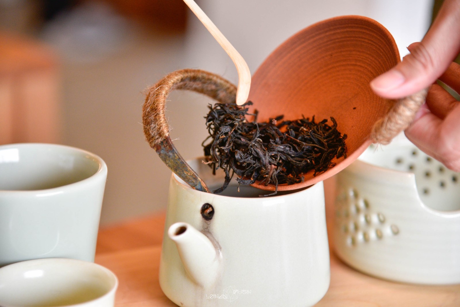 烤茶後,將茶葉撥入茶壺,倒入熱水靜置一陣子,倒入品茗杯中,琥珀色澤,晶瑩剔透。鹿谷紅,是使用烏龍品種製成的紅茶,經過長時間的發酵及一年的熟成才孕育出這樣的茶種。第一次喝到這品種,覺得茶香十足,有烏龍獨特的味道還有紅茶的馨香。