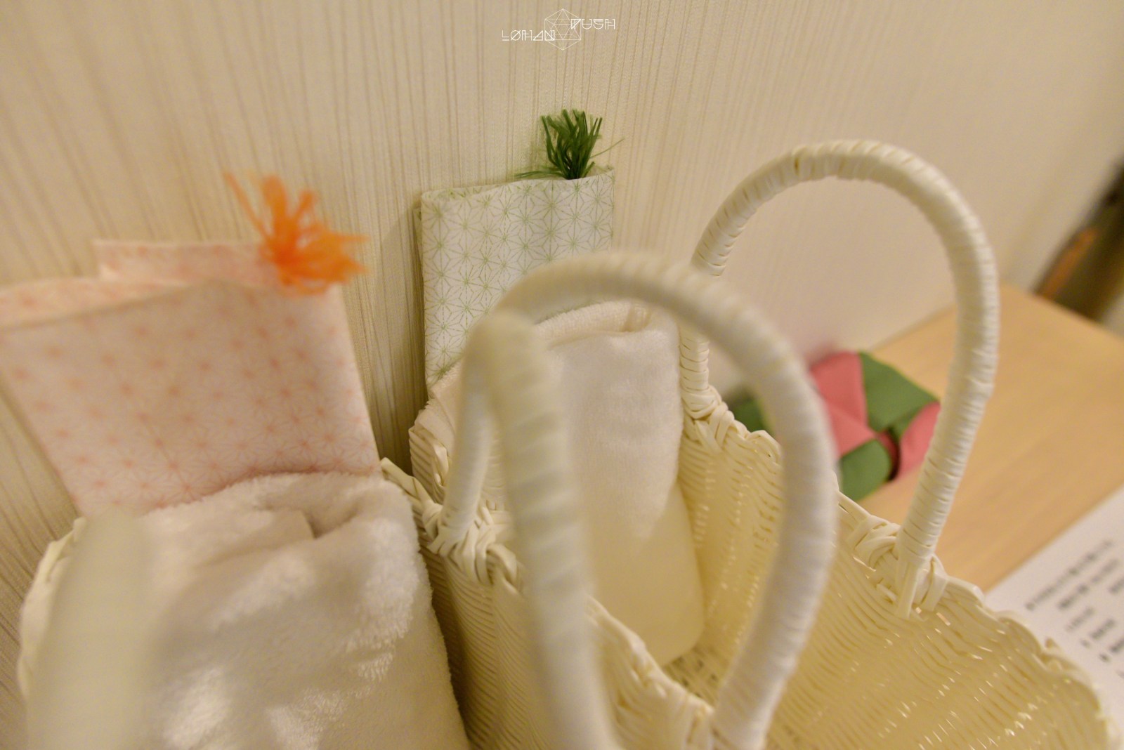 房間空間以度假型旅館來說並不算太大,大約是23平方公尺,但因為有室外空間還有整體的空間設計,讓人入住不會覺得壓迫,反而覺得蠻有質感。一進房看到的是一個小玄關空間,小矮櫃上擺放了備品及超可愛的白色小提籃,裡面擺放小方巾及不織布的小袋子,讓旅人可以穿著浴衣帶著小提籃在飯店中走動。
