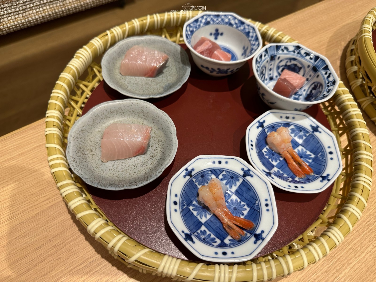 前菜區非常的精緻可愛,各種不同顏色的小盤裝著日式小菜,小菜大部分是生魚片、魚貝類,不只看起來好看,吃起來也不錯。