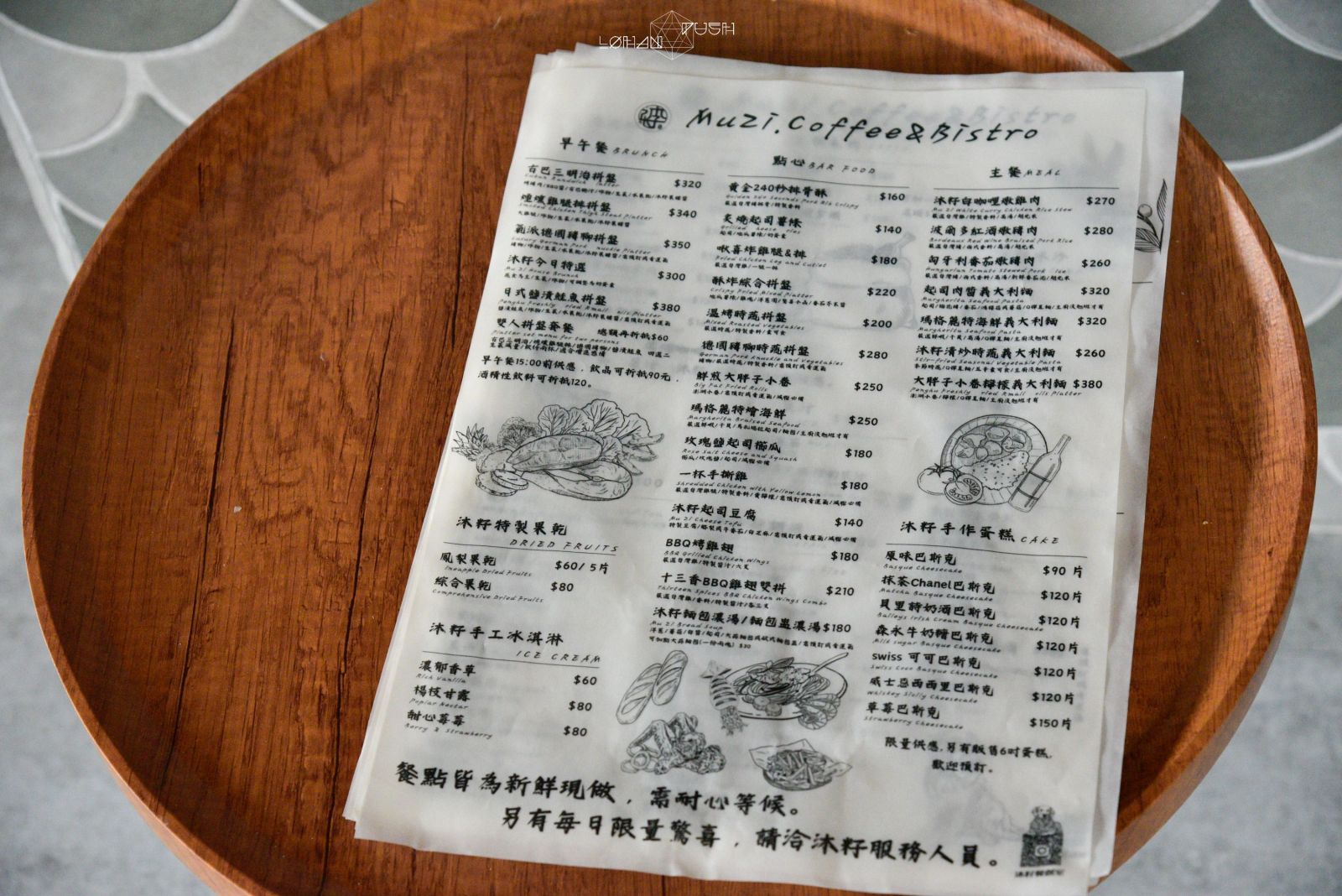 沐籽餐創室的餐點選擇不少,主要分成鹹食、甜點及飲料,鹹食部分有早午餐、主餐還有各式點心,飲料種類很多,區分有酒精及無酒精,還有其他咖啡、果汁及冰沙等。