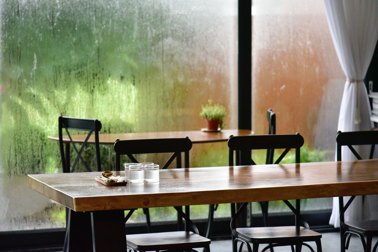室內使用水泥紅磚、木作及鐵件,再加上開放的大落地窗,將大量採光引入室內。老漢到訪那天下著細雨,光線還是可以透入室內,雖然因下雨而無法看到窗外的田園景色,但透著細雨看戶外有種朦朧美。