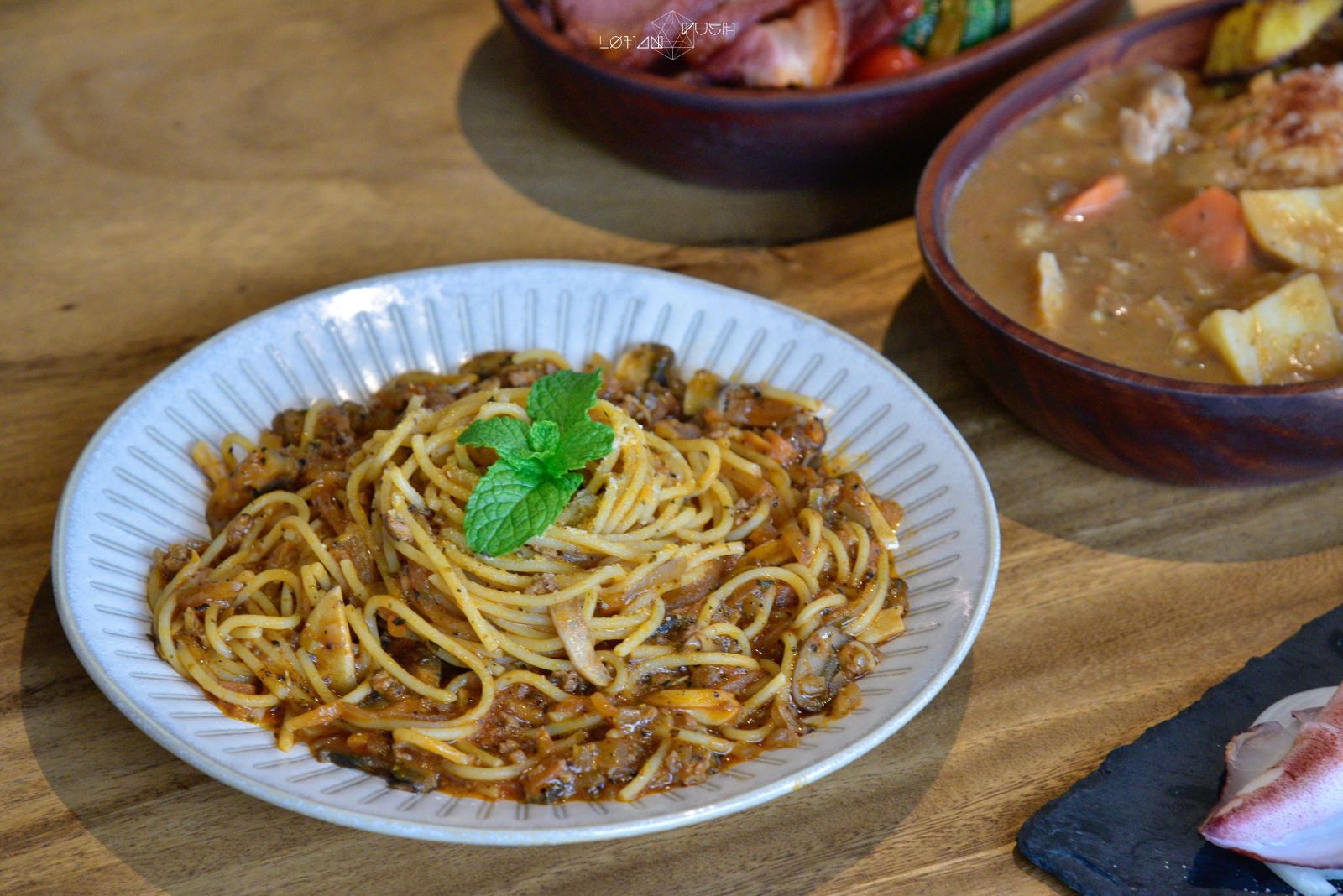 這道看起來家常的義大利麵,裡面使用大量的肉醬、番茄、蘑菇及洋蔥,番茄的酸香與洋蔥的甜平衡得剛剛好,讓人不自覺的一口接一口。