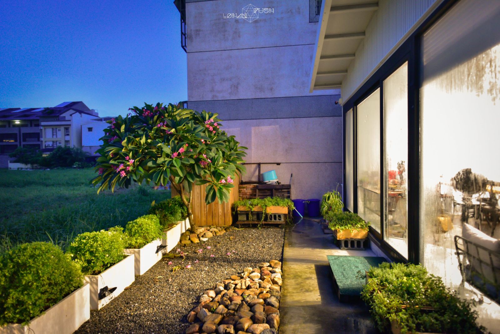 到了晚上,這裡是截然不同的氣氛。點燈後,溫暖的黃光讓白色貨櫃屋顯得更有感覺,夜色及小小燈光,像是幫這空間多加了柔和濾鏡,讓人心情也隨之放鬆。
